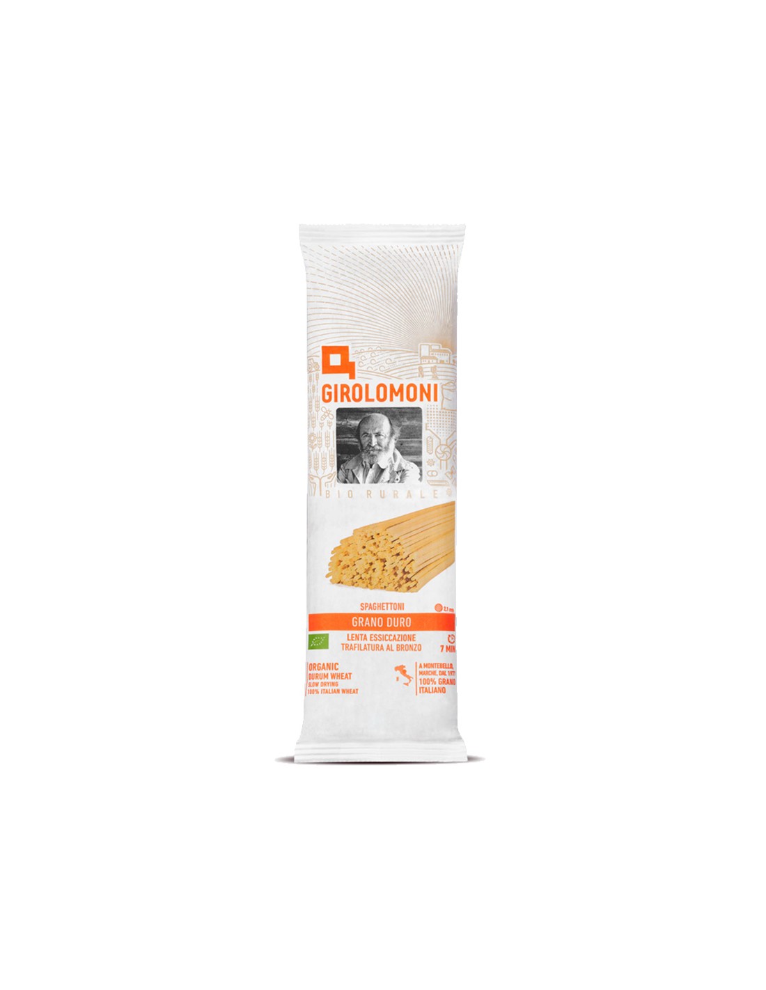 Spaghettoni di Grano Duro a Lenta Essicazione, hergestellt mit Bio-Weizen aus italienischem Anbau von Girolomoni. Absolute Qualität von einem der Pioniere des ökologischen Landbaus, der dazu beigetragen hat, die Kultur des Respekts für das Land und die Zutaten zu verbreiten. Perfektes Format für alle Arten von Saucen.