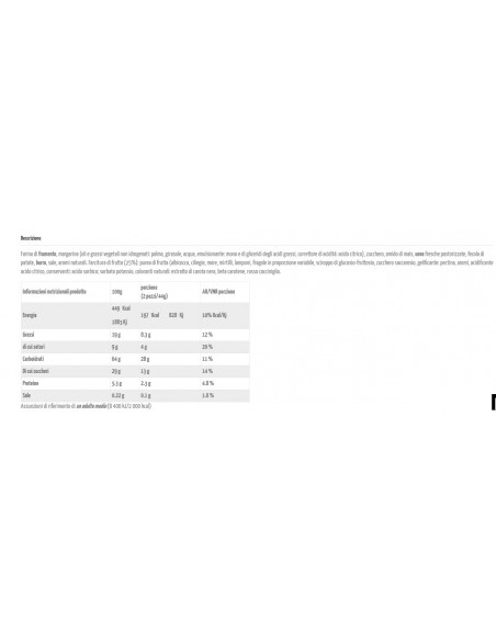 Ingredienti: Farina di frumento, zucchero, amido di mais, olio di girasole, destrosio, agenti lievitanti (carbonati di ammonio, carbonati di sodio, acido tartarico), latte scremato in polvere, estratto di malto d'orzo e mais, sale, aroma naturale.