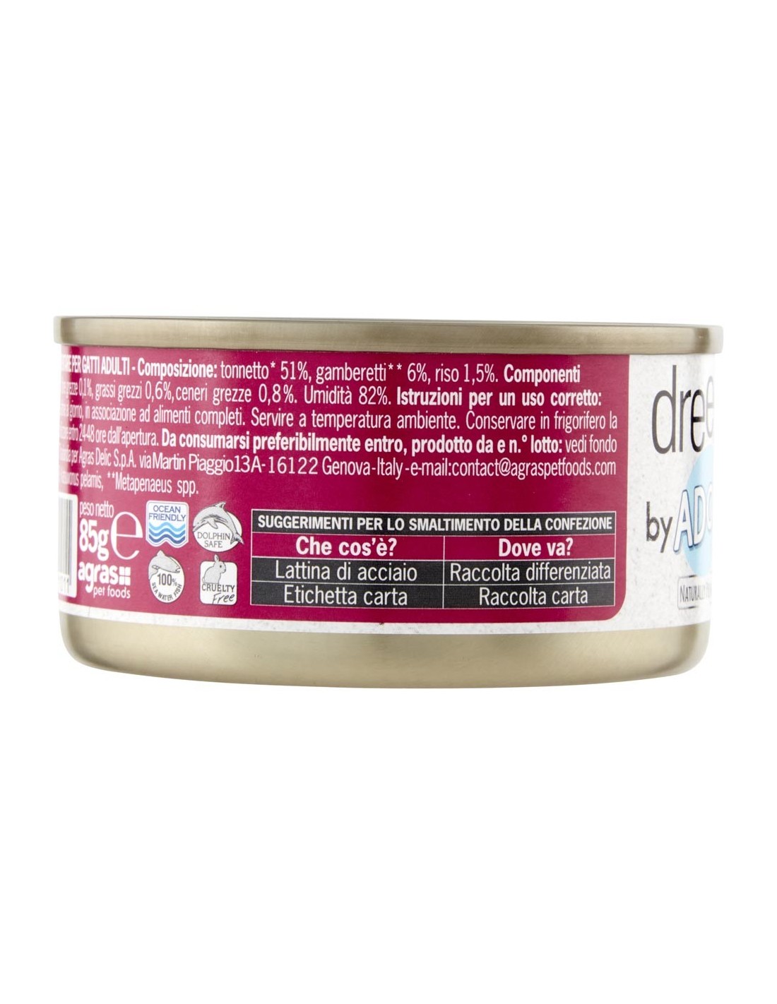 Composizione:, Tonnetto* 51%, Gamberetti** 6%, *(A) Euthynnus affinis (B) Katsuwonus pelamis, **Metapenaeus spp